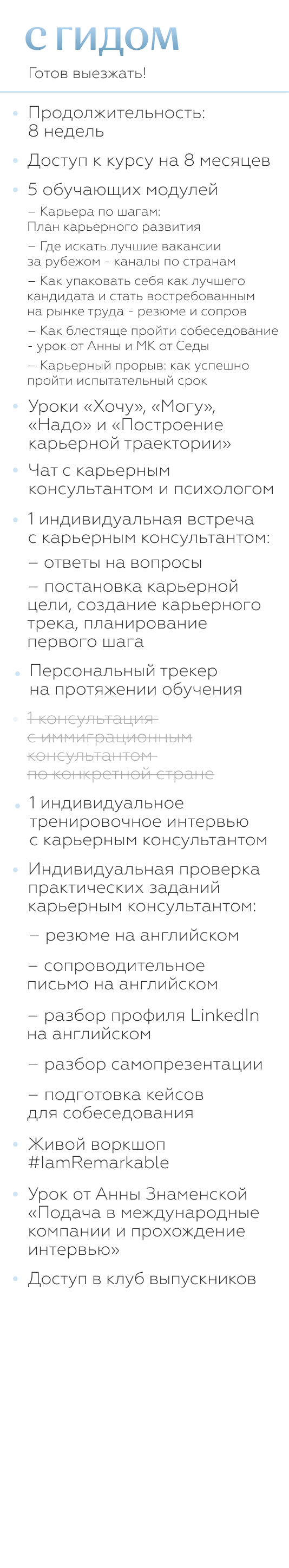 На консультации с карьерным консультантом вы получите честную обратную связь по перспективам релокации на основе своего резюме и вместе план действий на ближайшую перспективу, разберете, на какие вакансии вам следует откликаться.