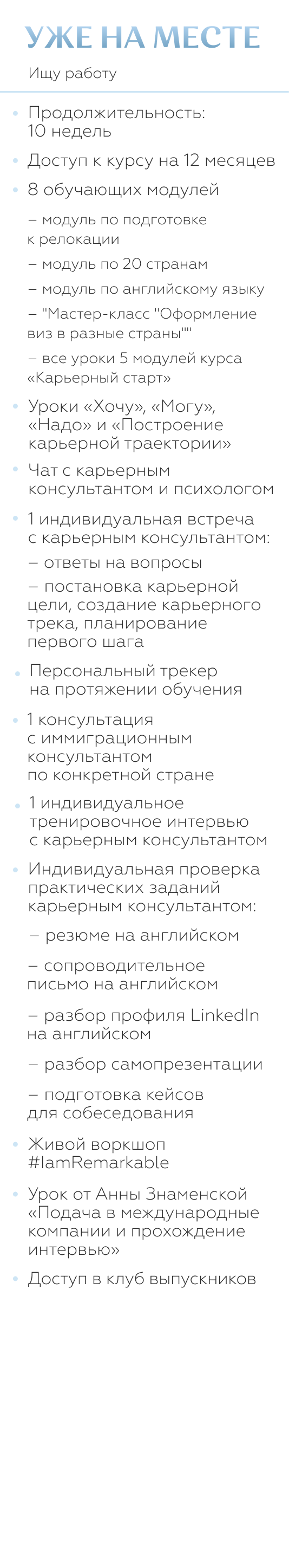 На курсе «Rелокация с Анной Знаменской» вы подготовитесь к релокации и построению карьеры за рубежом, опираясь на опыт, знания и поддержку профессионалов, которые построили успешную карьеру в разных странах мира и помогли сделать это десяткам своих клиентов.