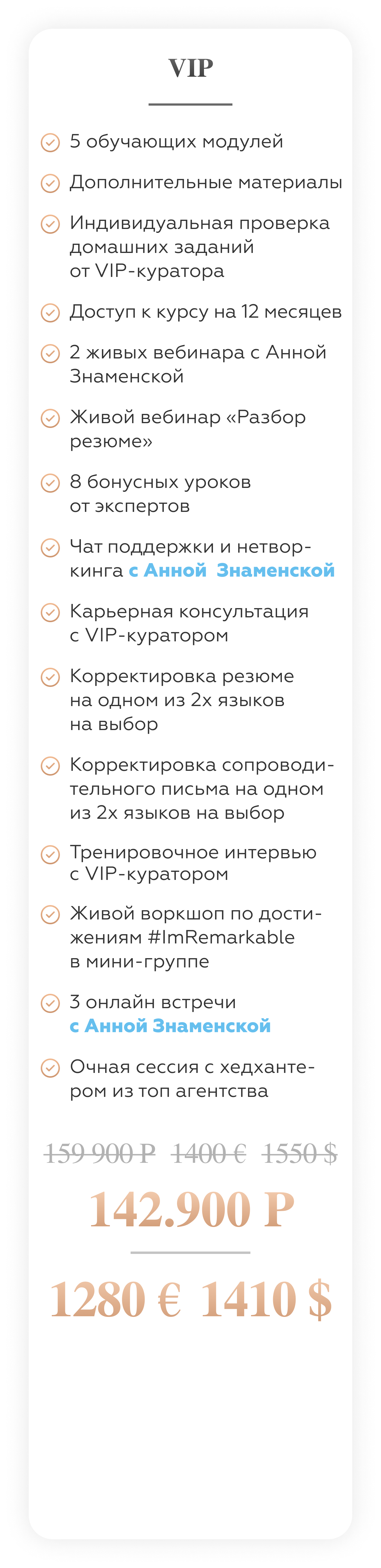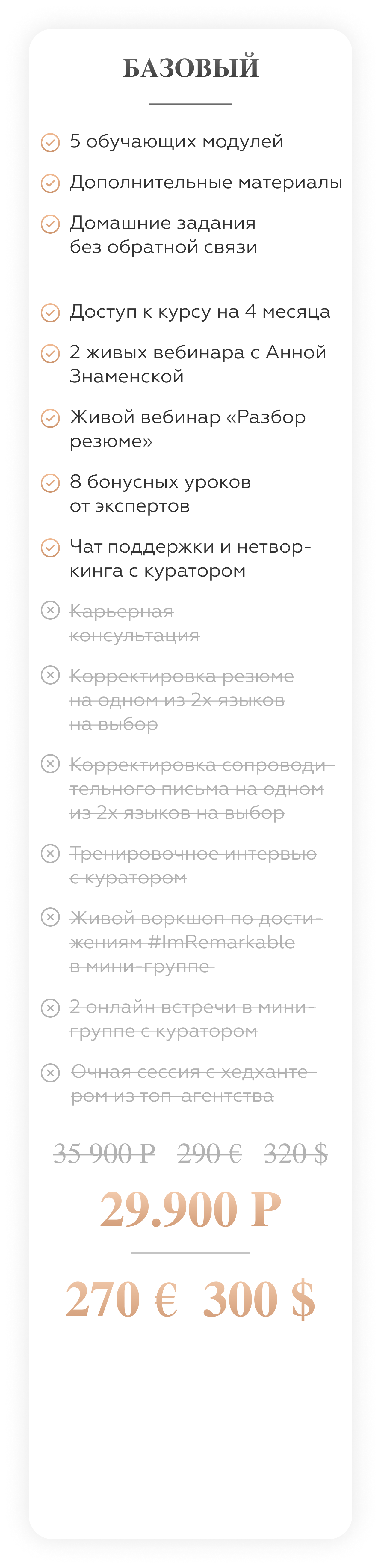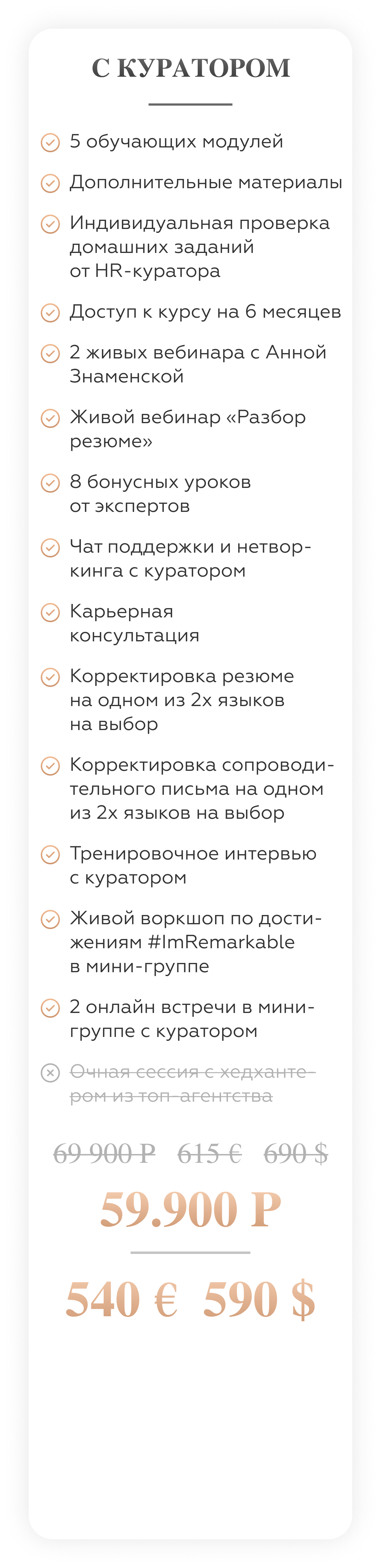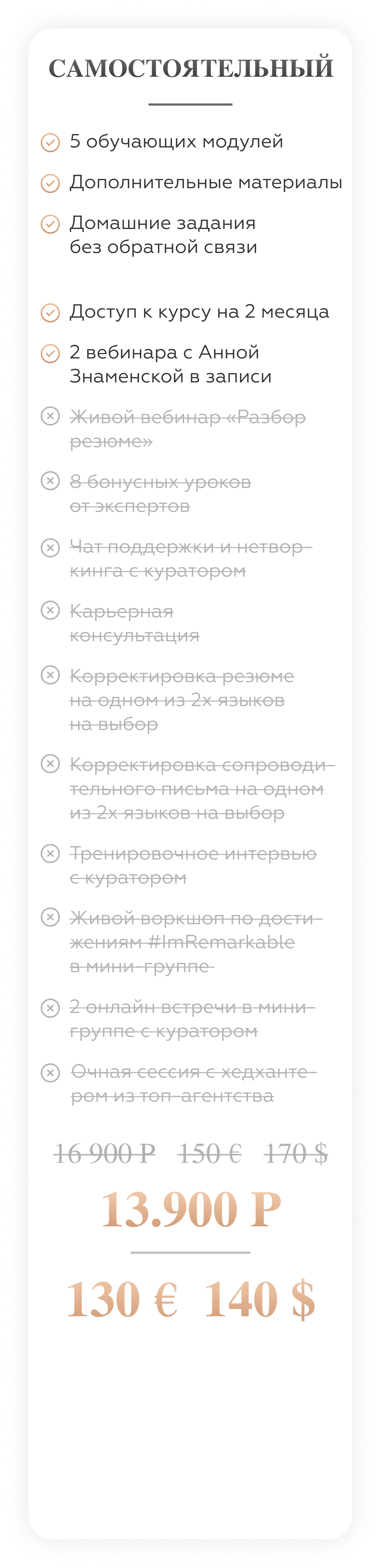На курсе вы получаете пошаговую систему выстраивания карьеры от действующего топ-менеджера с 20-летним опытом работы. В интернете вы найдете устаревшие шаблоны резюме и банальные правила поведения на собеседовании.