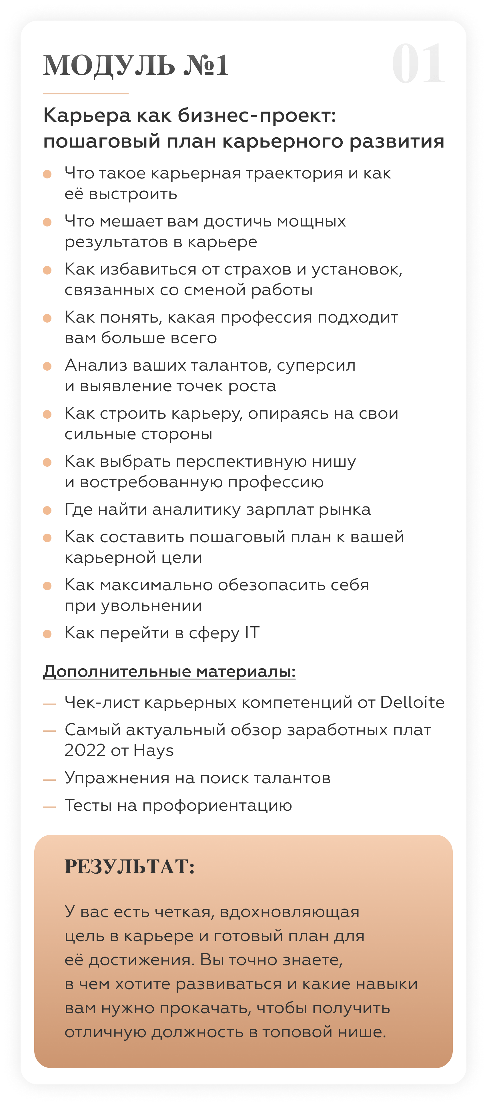 Вы увидите перспективы развития внутри компании, поймете, какие навыки нужно прокачать, чтобы стать первым кандидатом на повышение. Вы научитесь выстраивать отношения с начальством и договариваться об увеличении зарплаты, усилите свой личный бренд, прокачаете уверенность в себе.