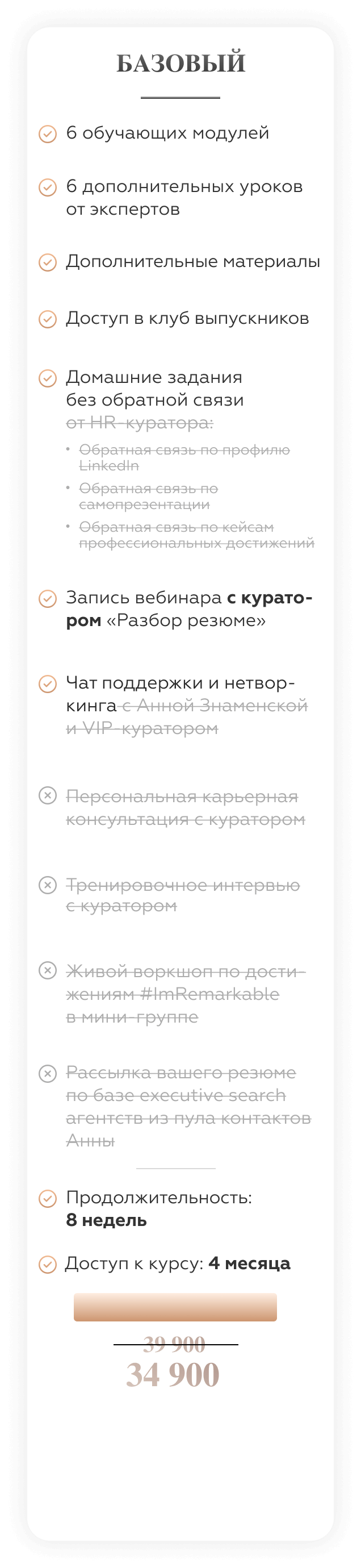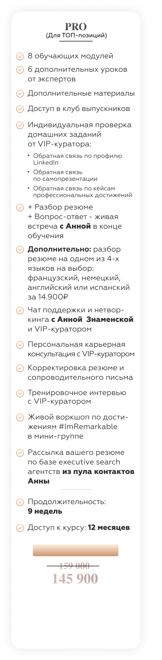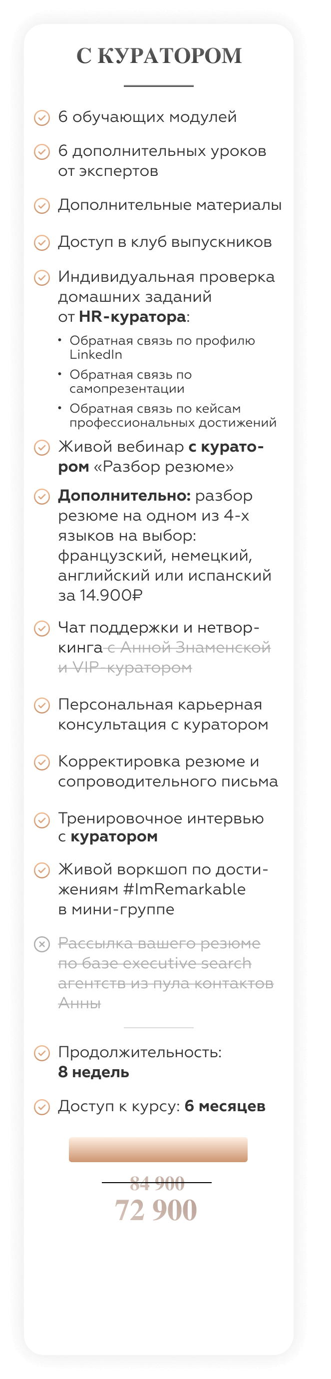 На курсе вы получаете пошаговую систему выстраивания карьеры от действующего топ-менеджера с 20-летним опытом работы. В интернете вы найдете устаревшие шаблоны резюме и банальные правила поведения на собеседовании.