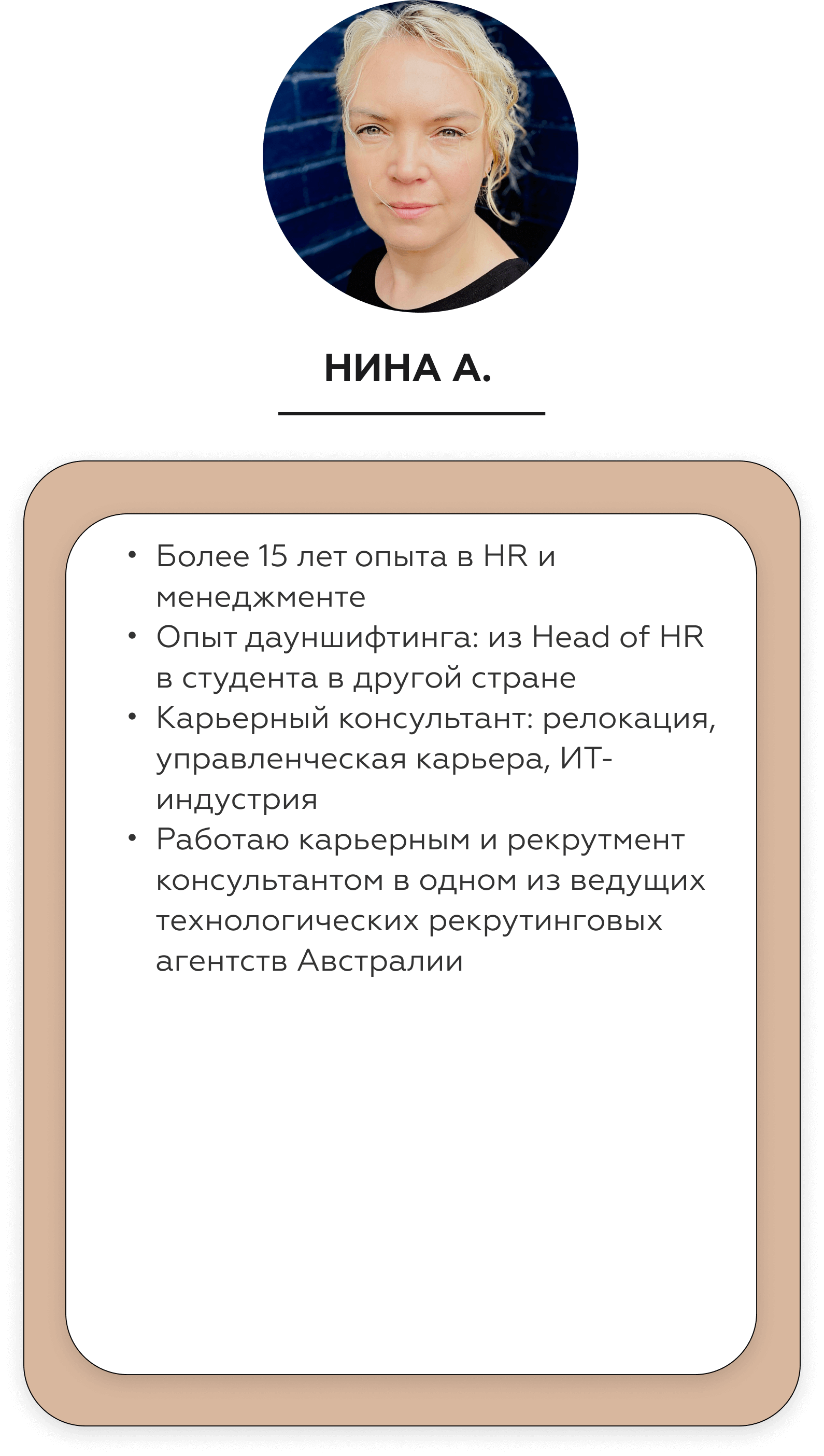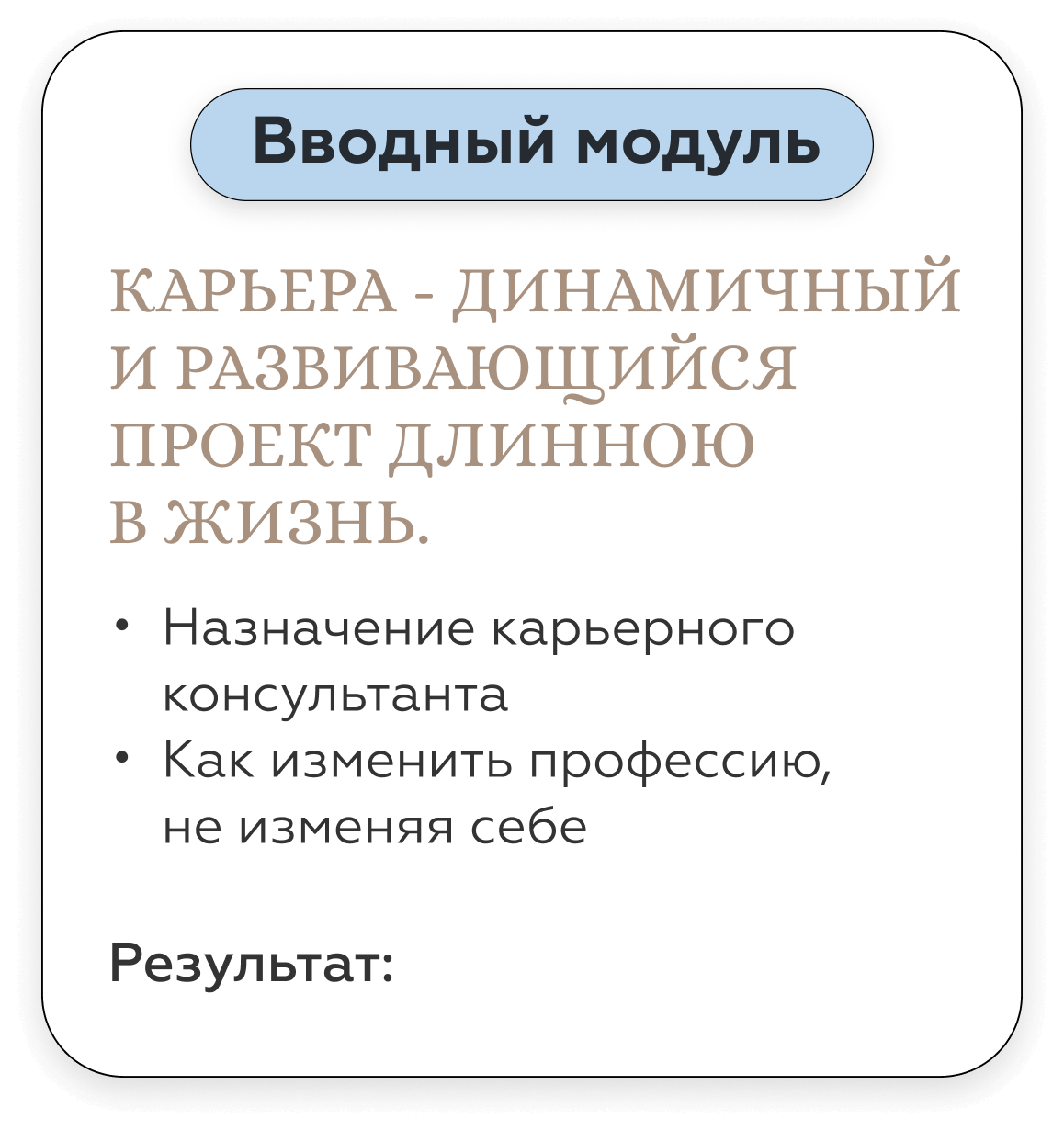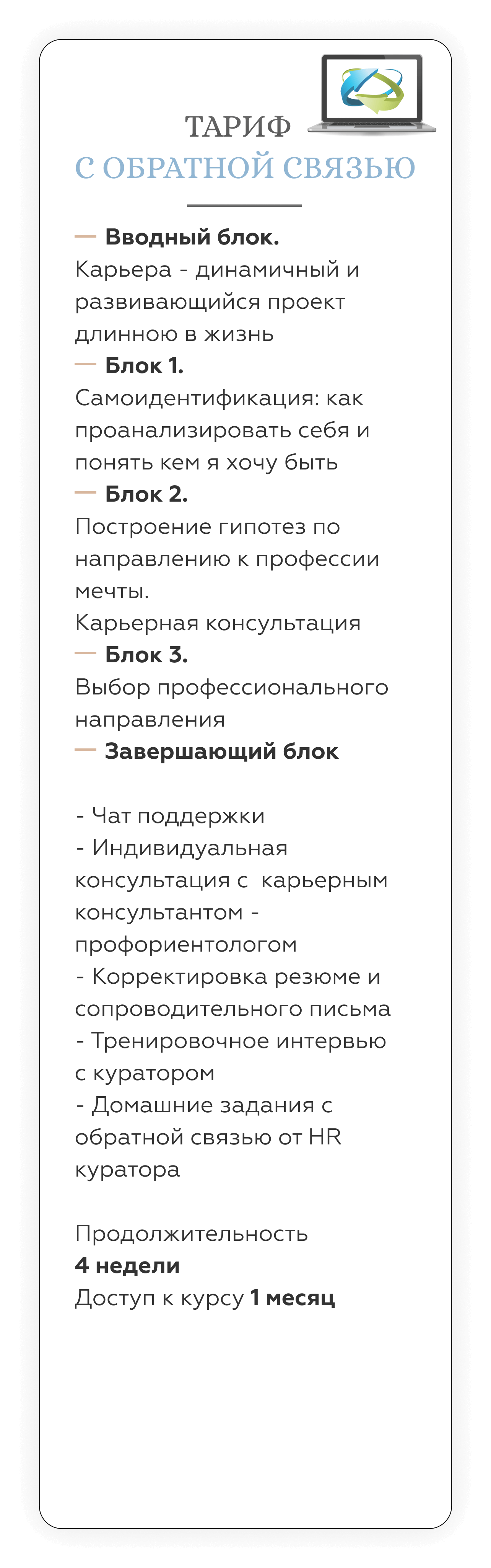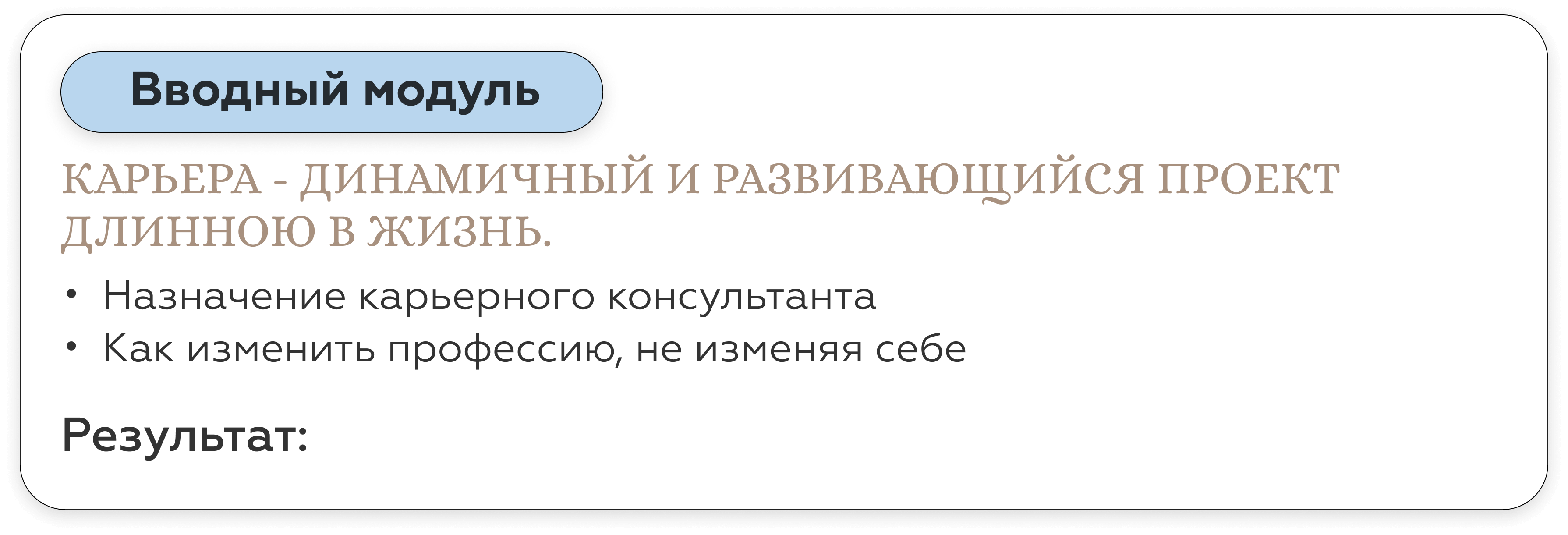Карьерный консультант дает вам готовые решения под конкретный запрос. Наш курс — учит работать с инструментами по управлению карьерой и быть адаптивным к разным ситуациям на рынке труда. Кроме того, на курсе вы гарантировано будете работать с опытными карьерными Консультантами - профориентологами — действующими топ-менеджерами, таких компаний как: РЖД, Fazer, Bosh, Xiaomi, X5 Retail group, SPAR, Hewlett-Packard. Найти специалистов такого уровня на просторах интернета — не просто.