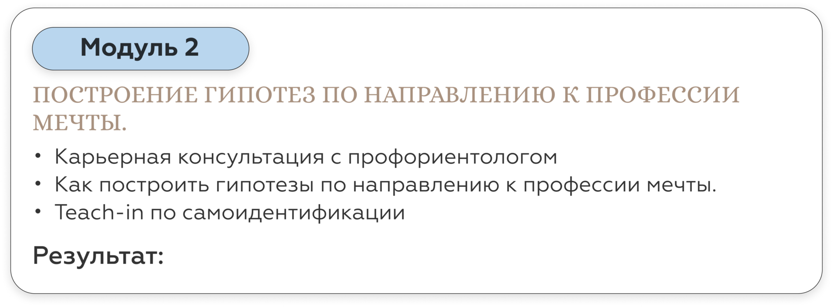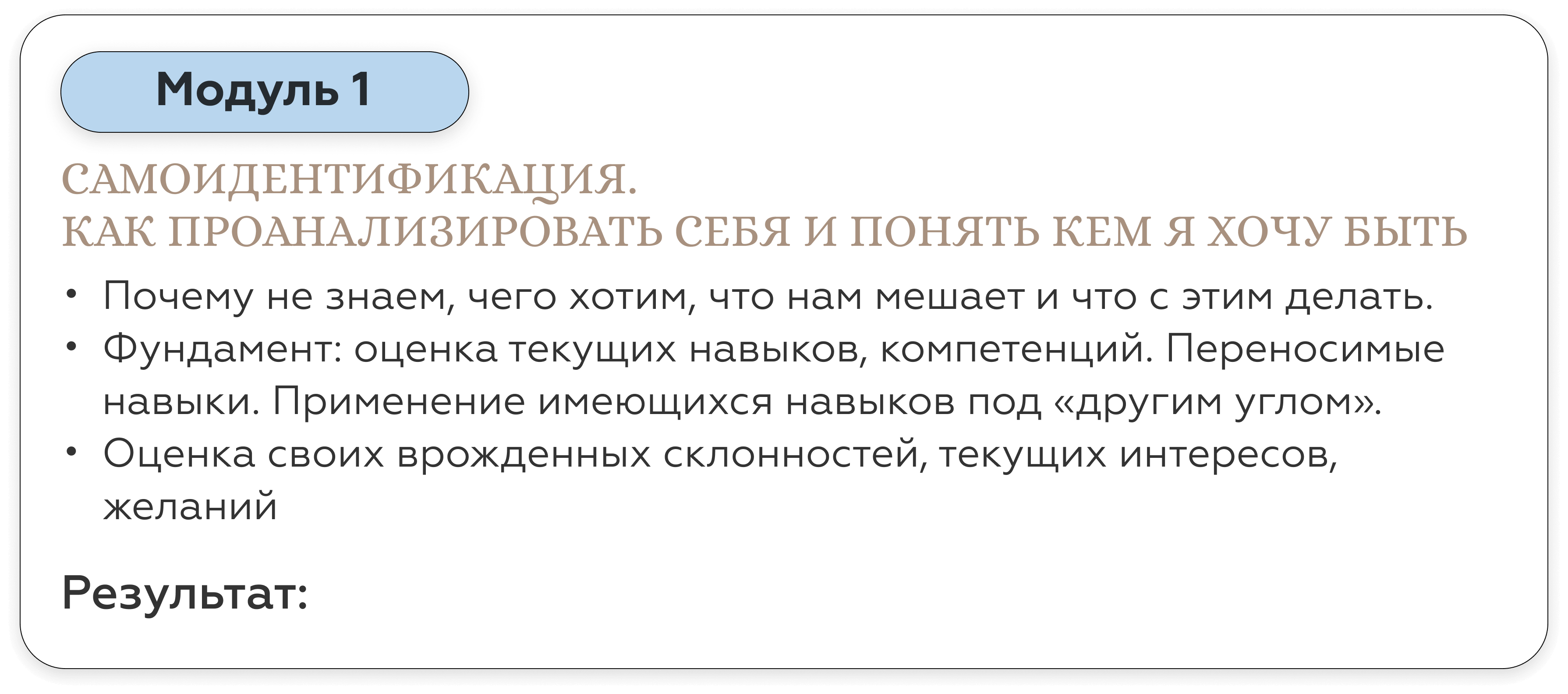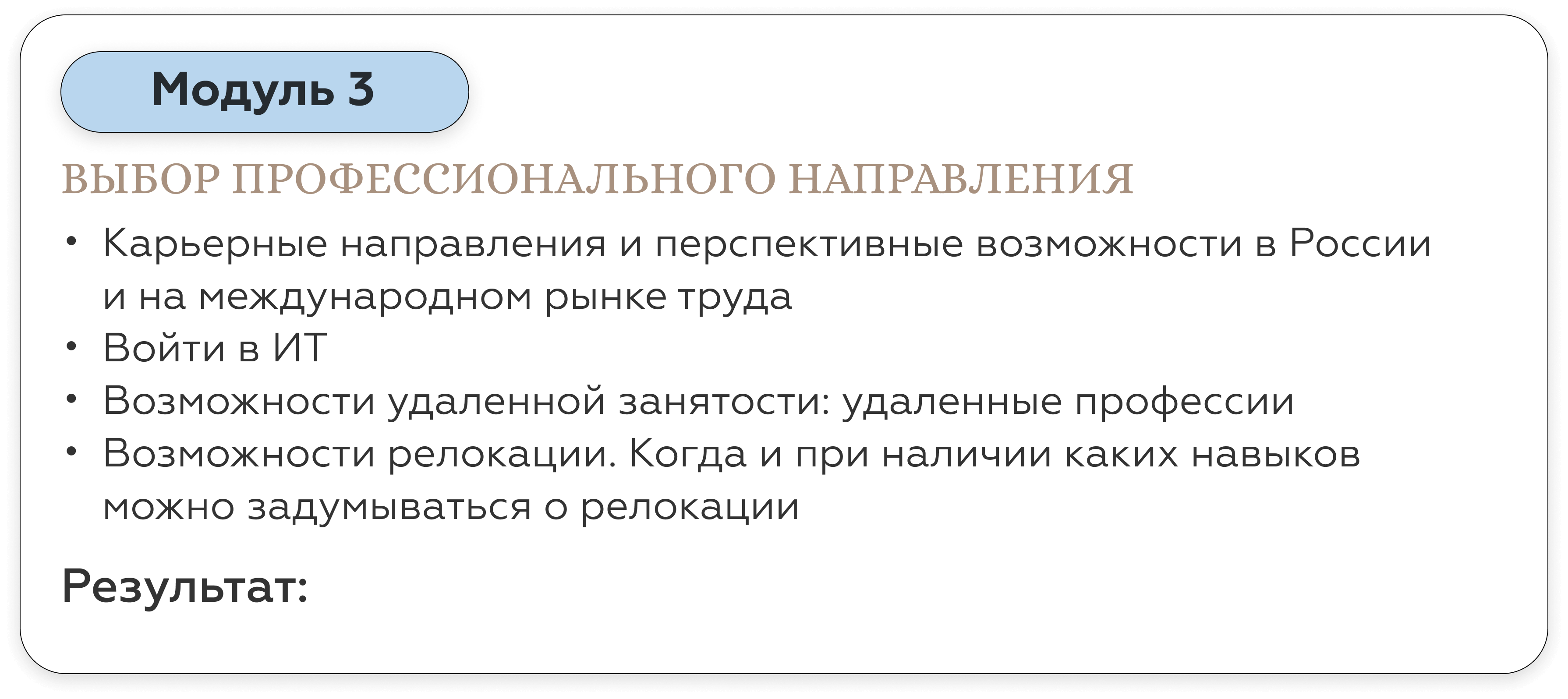 Карьерный консультант дает вам готовые решения под конкретный запрос. Наш курс — учит работать с инструментами по управлению карьерой и быть адаптивным к разным ситуациям на рынке труда. Кроме того, на курсе вы гарантировано будете работать с опытными карьерными Консультантами - профориентологами — действующими топ-менеджерами, таких компаний как: РЖД, Fazer, Bosh, Xiaomi, X5 Retail group, SPAR, Hewlett-Packard. Найти специалистов такого уровня на просторах интернета — не просто.