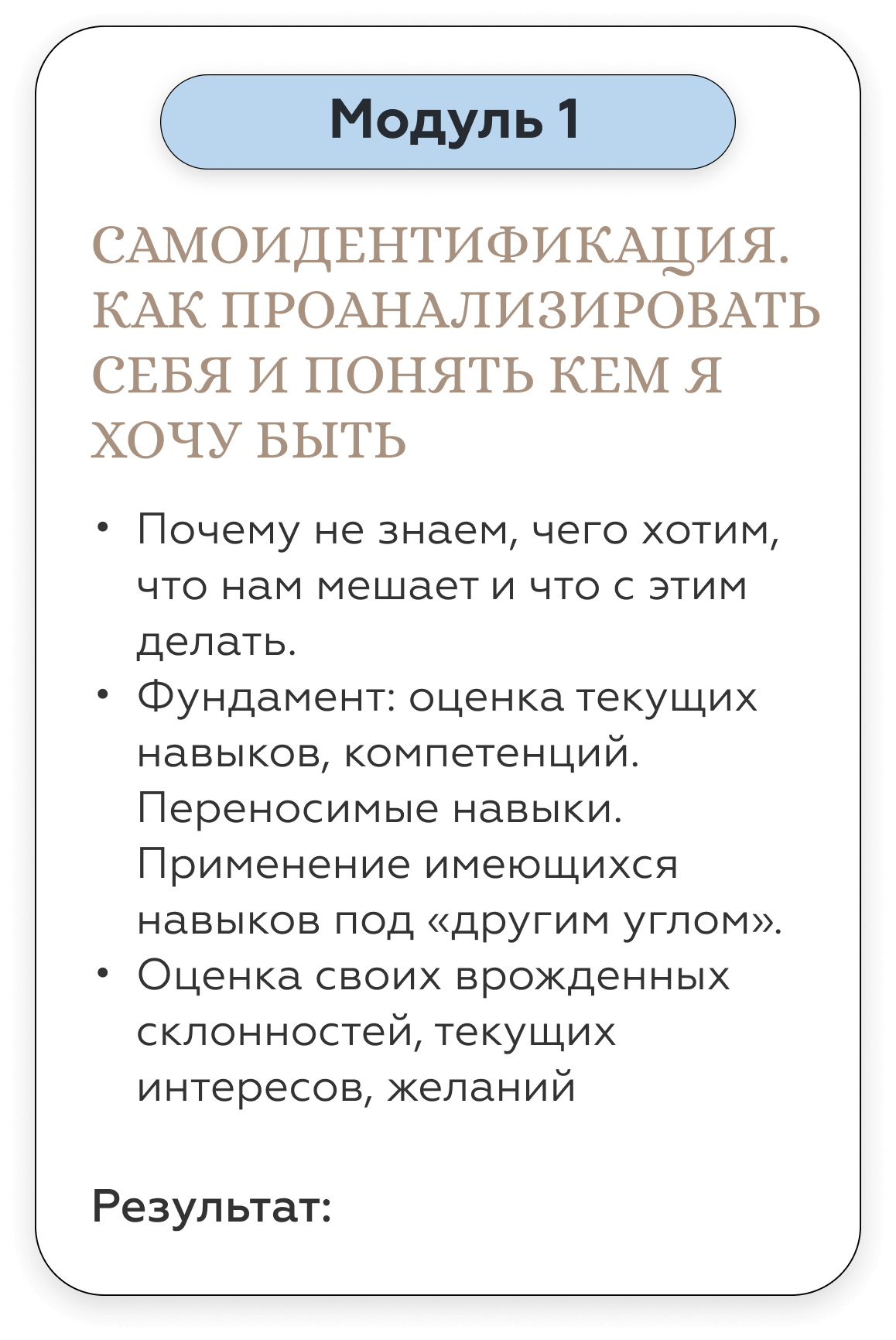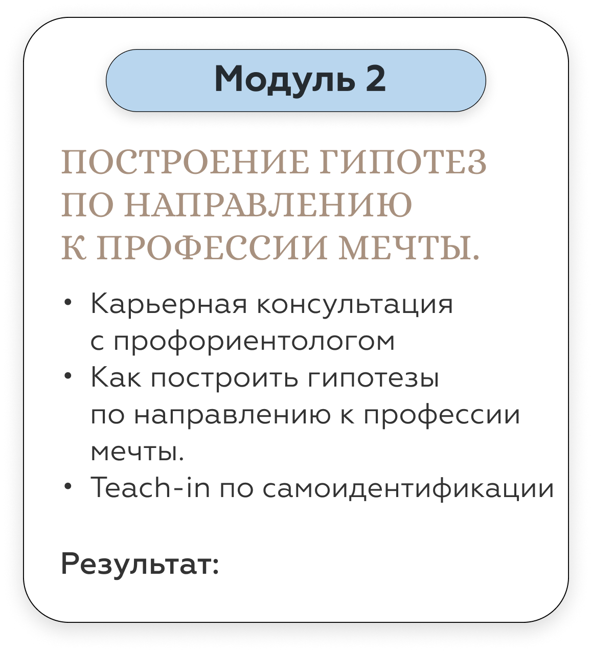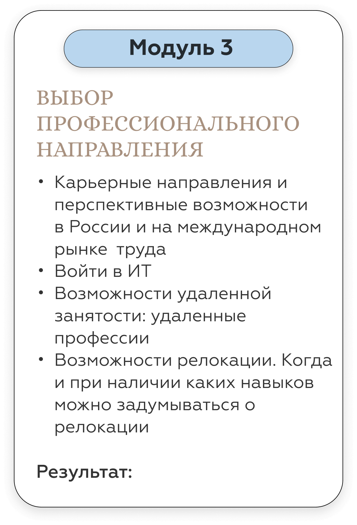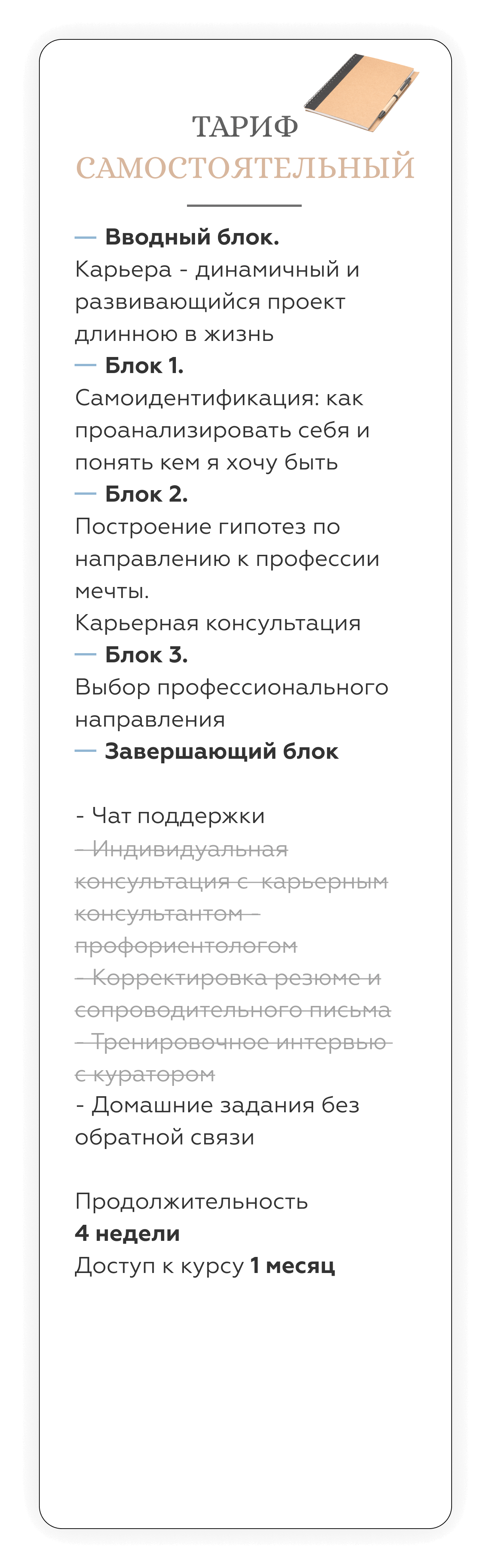Карьерный консультант дает вам готовые решения под конкретный запрос. Наш курс — учит работать с инструментами по управлению карьерой и быть адаптивным к разным ситуациям на рынке труда. Кроме того, на курсе вы гарантировано будете работать с опытными карьерными Консультантами - профориентологами — действующими топ-менеджерами, таких компаний как: РЖД, Fazer, Bosh, Xiaomi, X5 Retail group, SPAR, Hewlett-Packard. Найти специалистов такого уровня на просторах интернета — не просто.