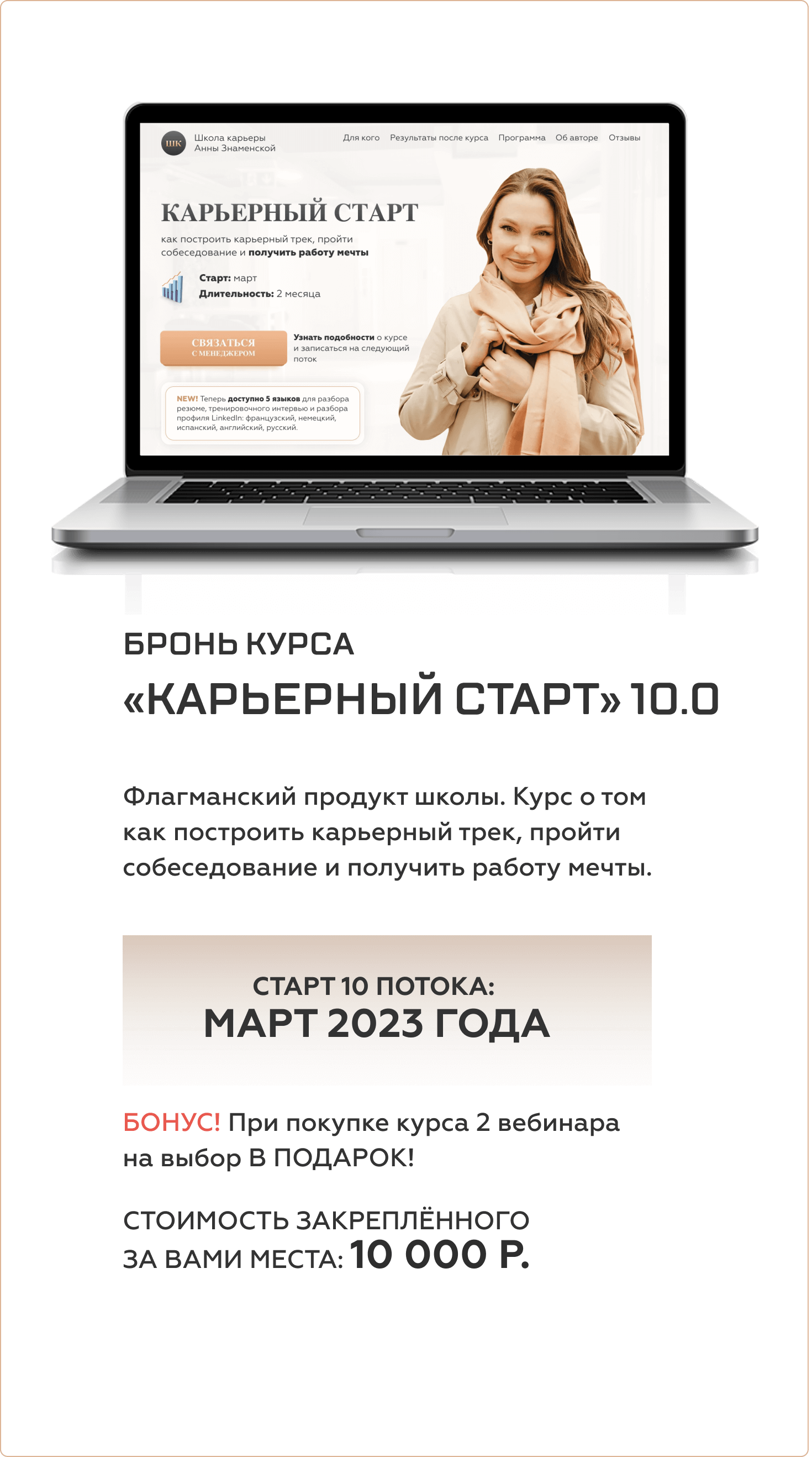 Просто заполните форму выше — и вы получите письмо на e-mail с промокодом на денежный номинал или любой другой образовательный продукт Школы карьеры Анны Знаменской.