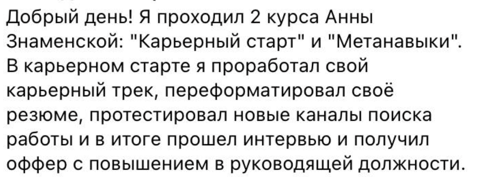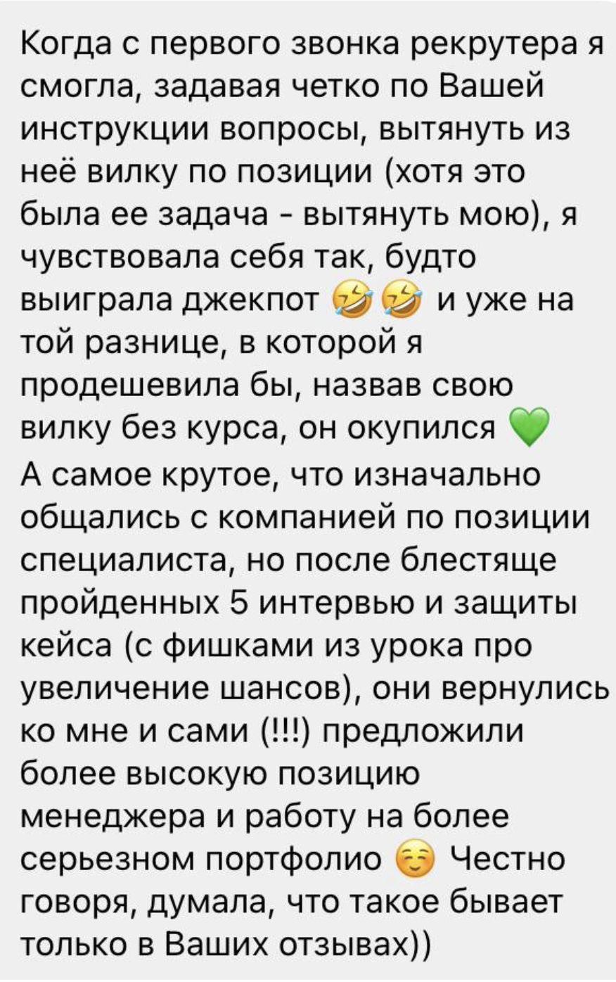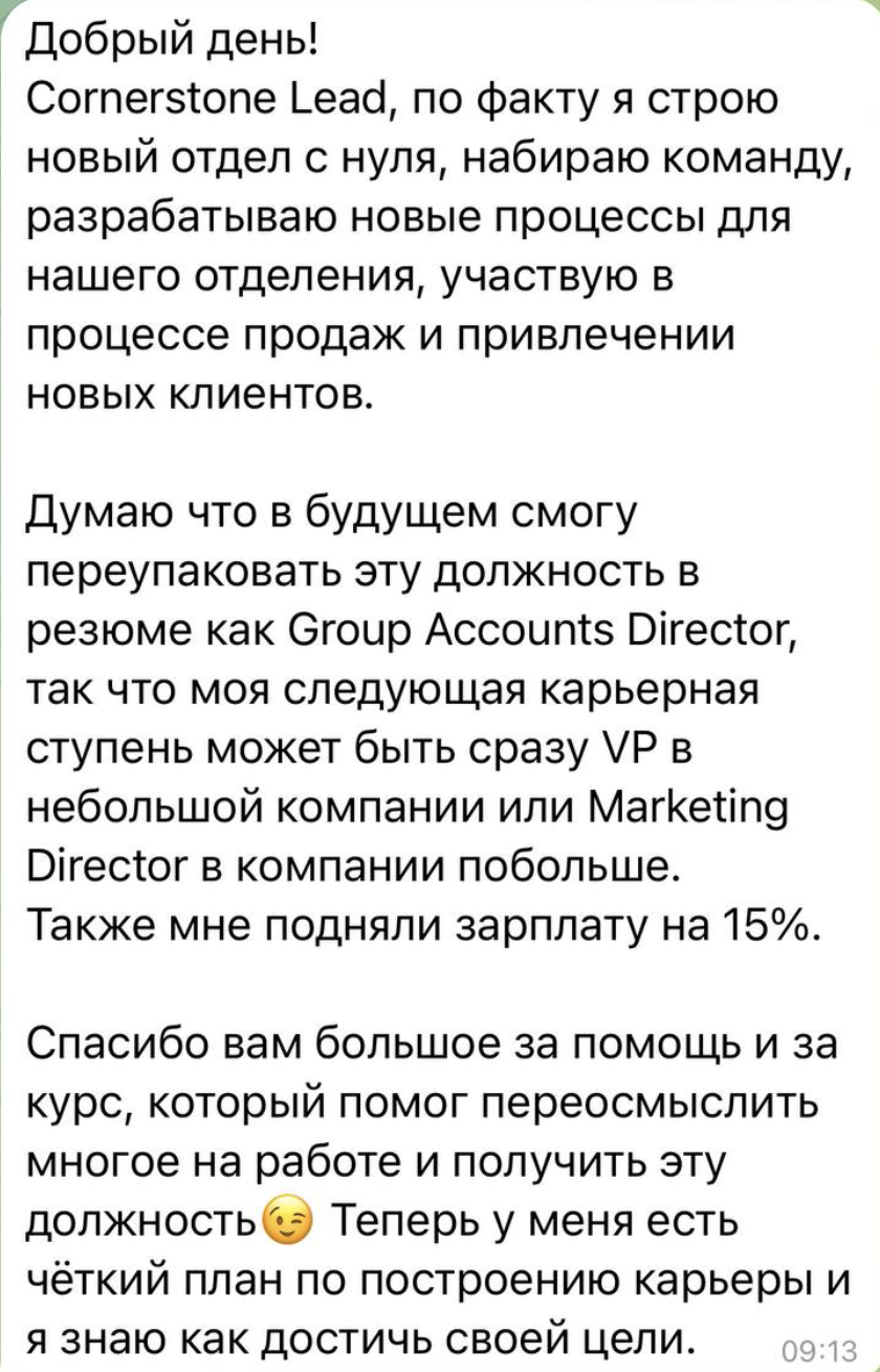 - Найдете и сформулируете свои достижения, научитесь их эффектно презентовать, чтобы получить оффер на более высокую позицию