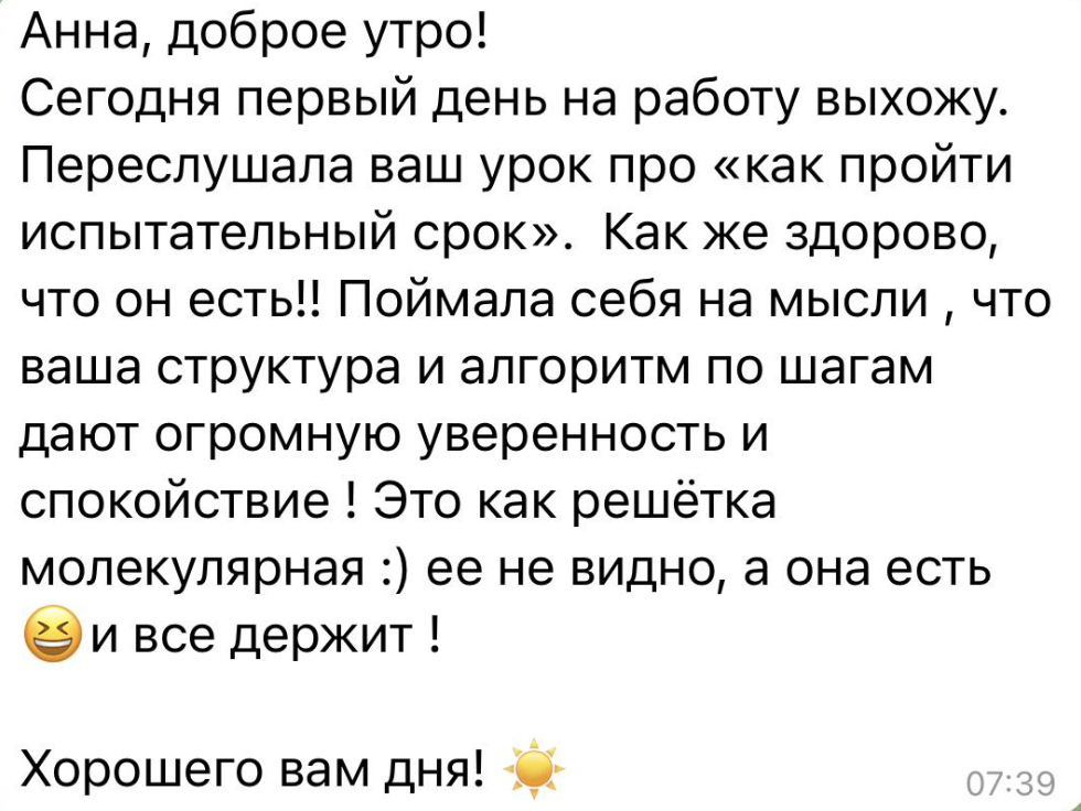 - Узнаете, как успешно стартовать в новой работе и проявить себя на испытательном сроке