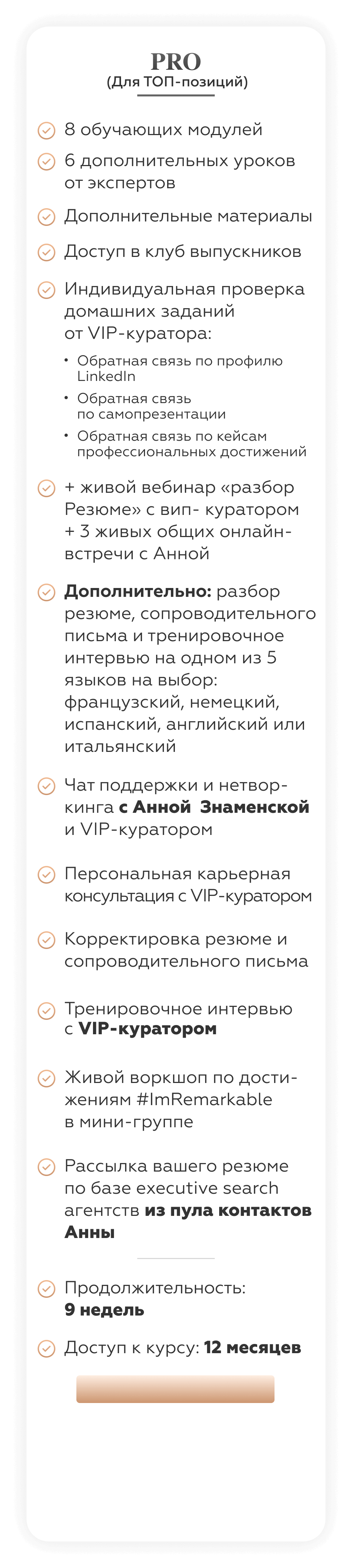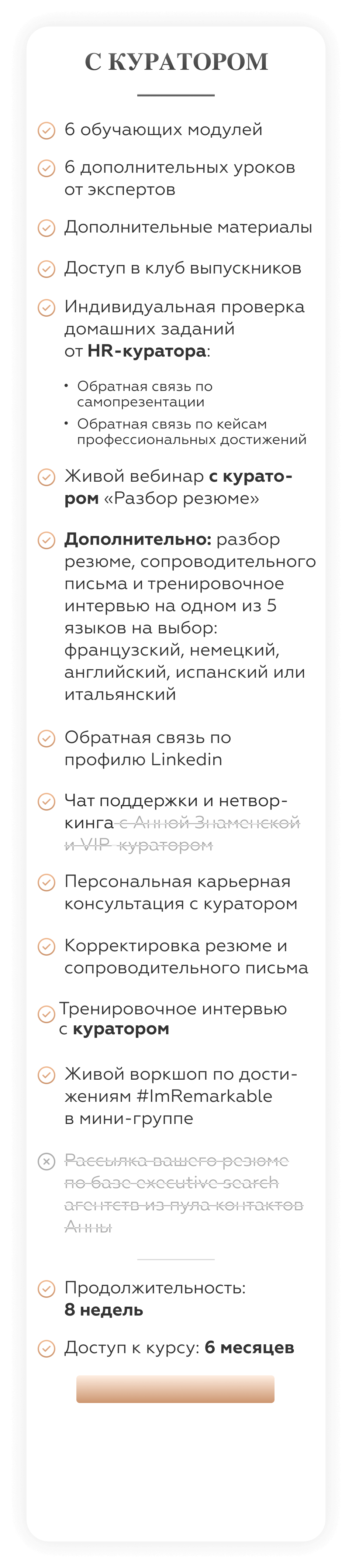 Карьерный консультант дает вам готовые решения под конкретный запрос. Наш курс — учит работать с инструментами по управлению карьерой и быть адаптивным к разным ситуациям на рынке труда. Кроме того, на курсе вы гарантировано будете работать с опытными карьерными консультантами — действующими топ-менеджерами, таких компаний как: РЖД, Fazer, Bosh, Xiaomi, X5 Retail group, SPAR, Hewlett-Packard. Найти специалистов такого уровня на просторах интернета — не просто.