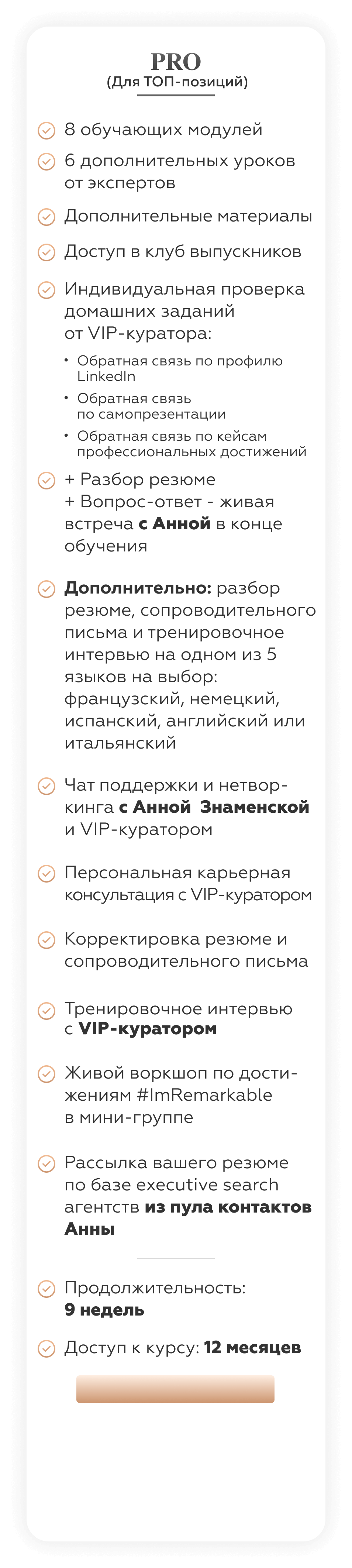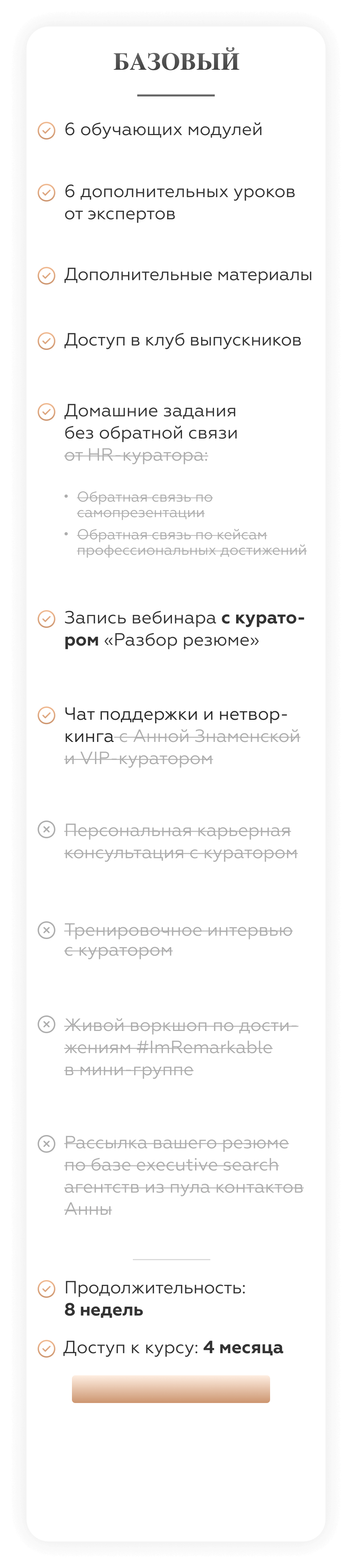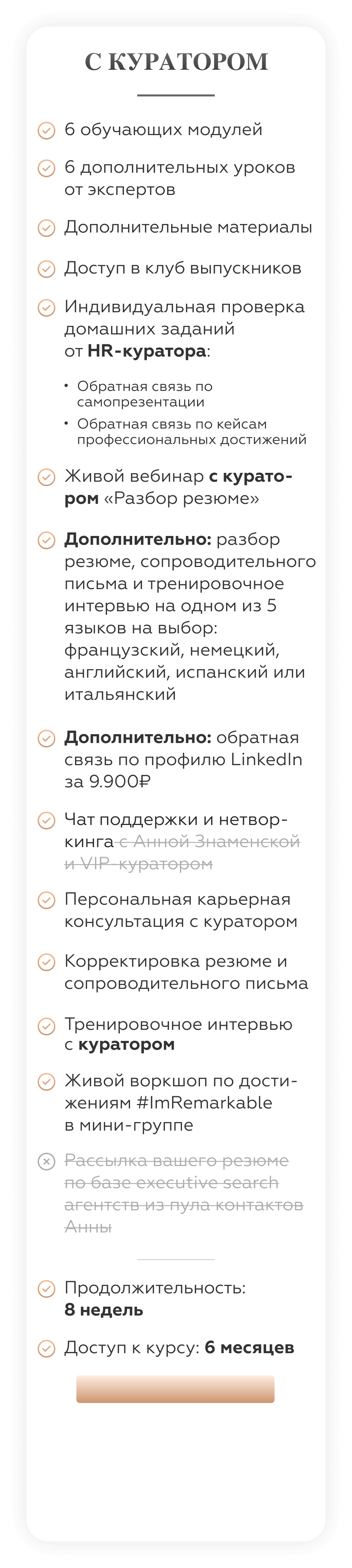 Карьерный консультант дает вам готовые решения под конкретный запрос. Наш курс — учит работать с инструментами по управлению карьерой и быть адаптивным к разным ситуациям на рынке труда. Кроме того, на курсе вы гарантировано будете работать с опытными карьерными консультантами — действующими топ-менеджерами, таких компаний как: РЖД, Fazer, Bosh, Xiaomi, X5 Retail group, SPAR, Hewlett-Packard. Найти специалистов такого уровня на просторах интернета — не просто.